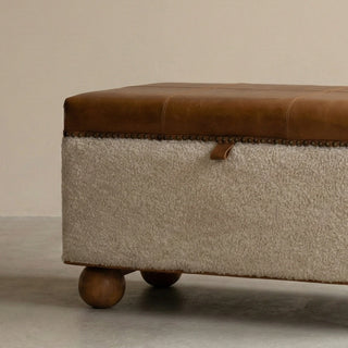 Bouclé Ottoman Cream Leather-Top Lid-Up Storage