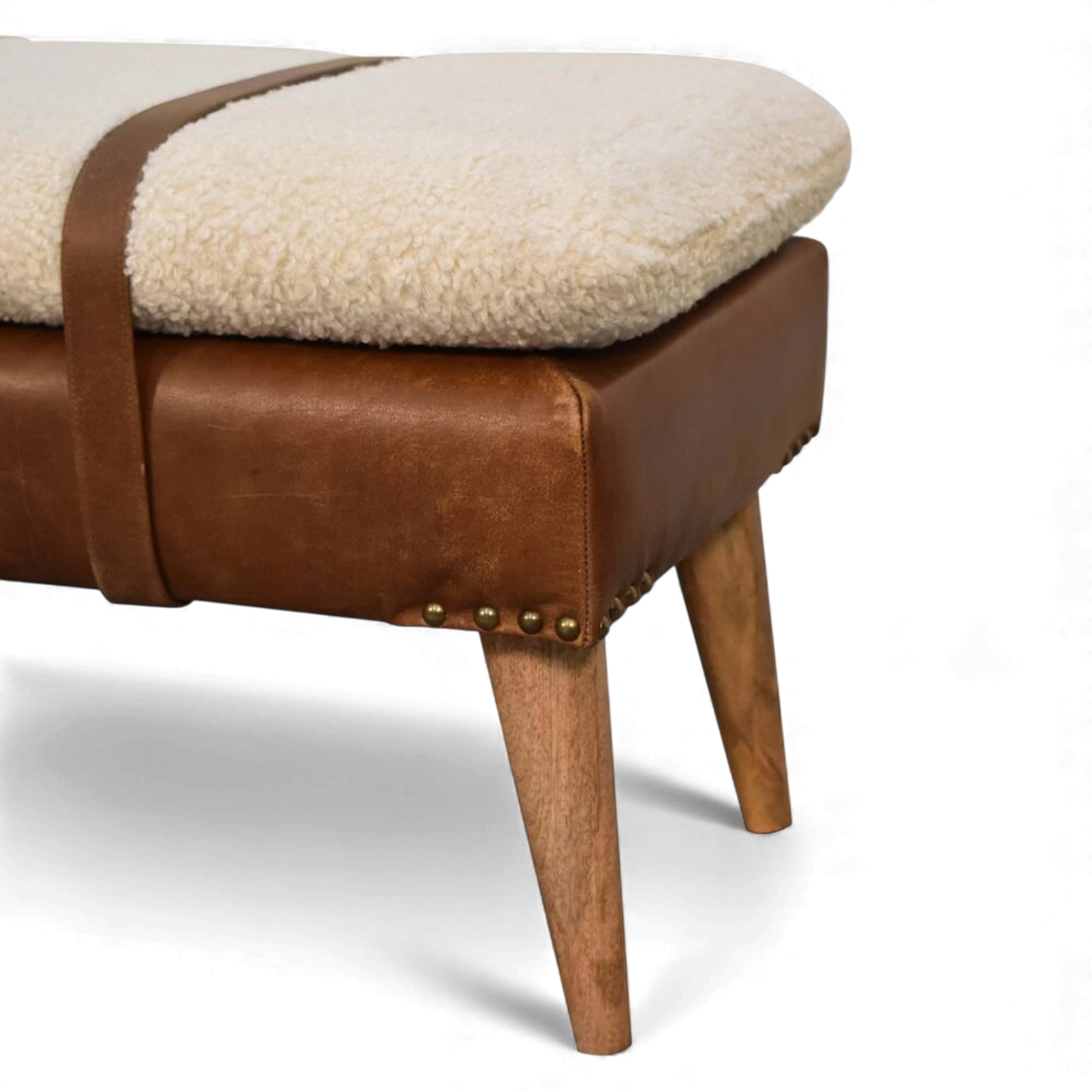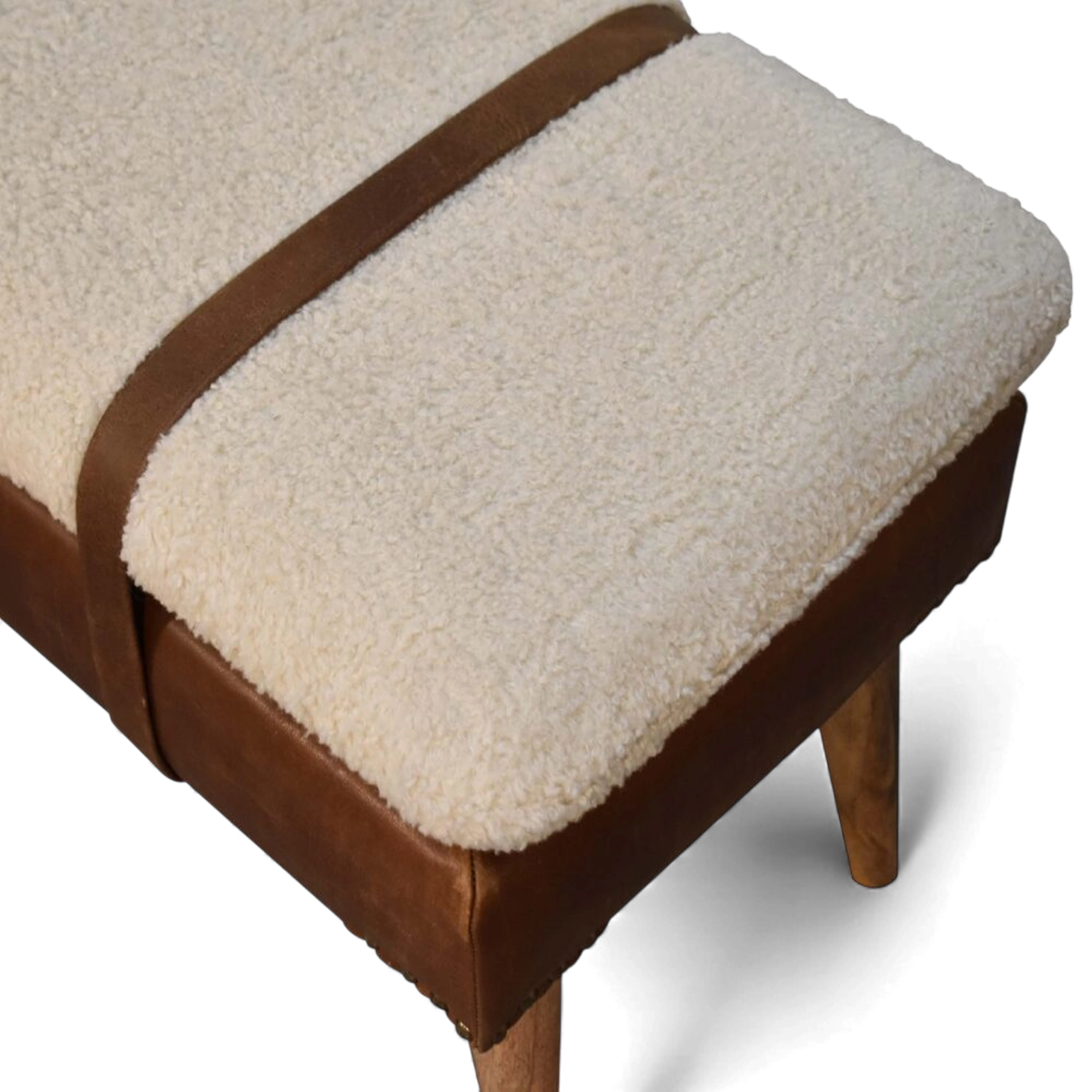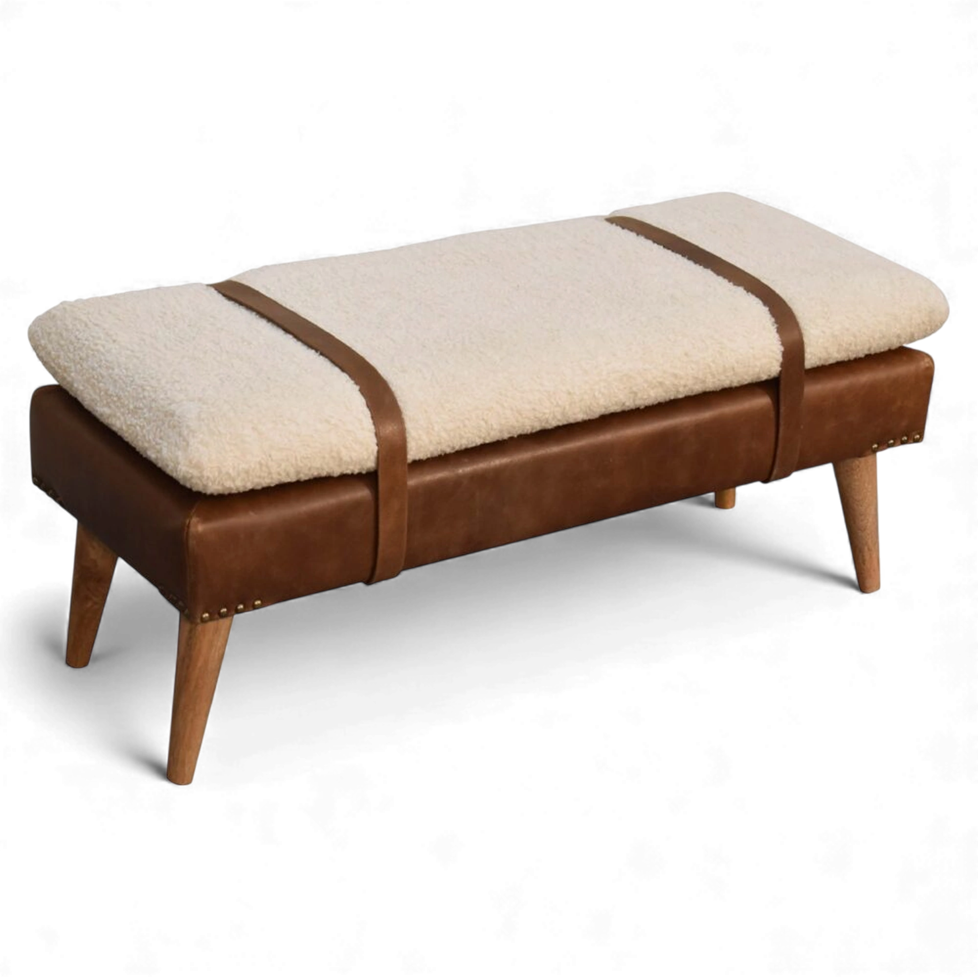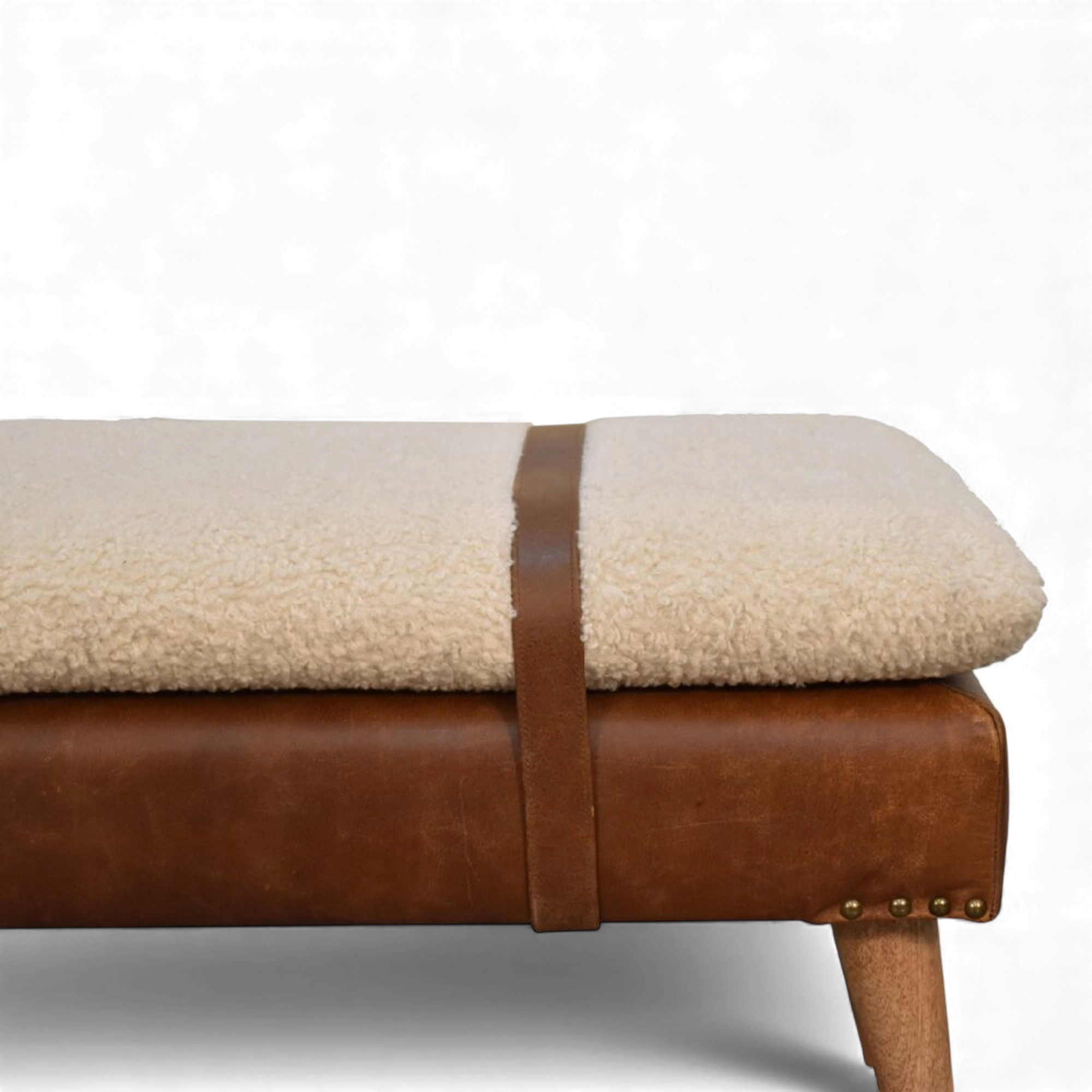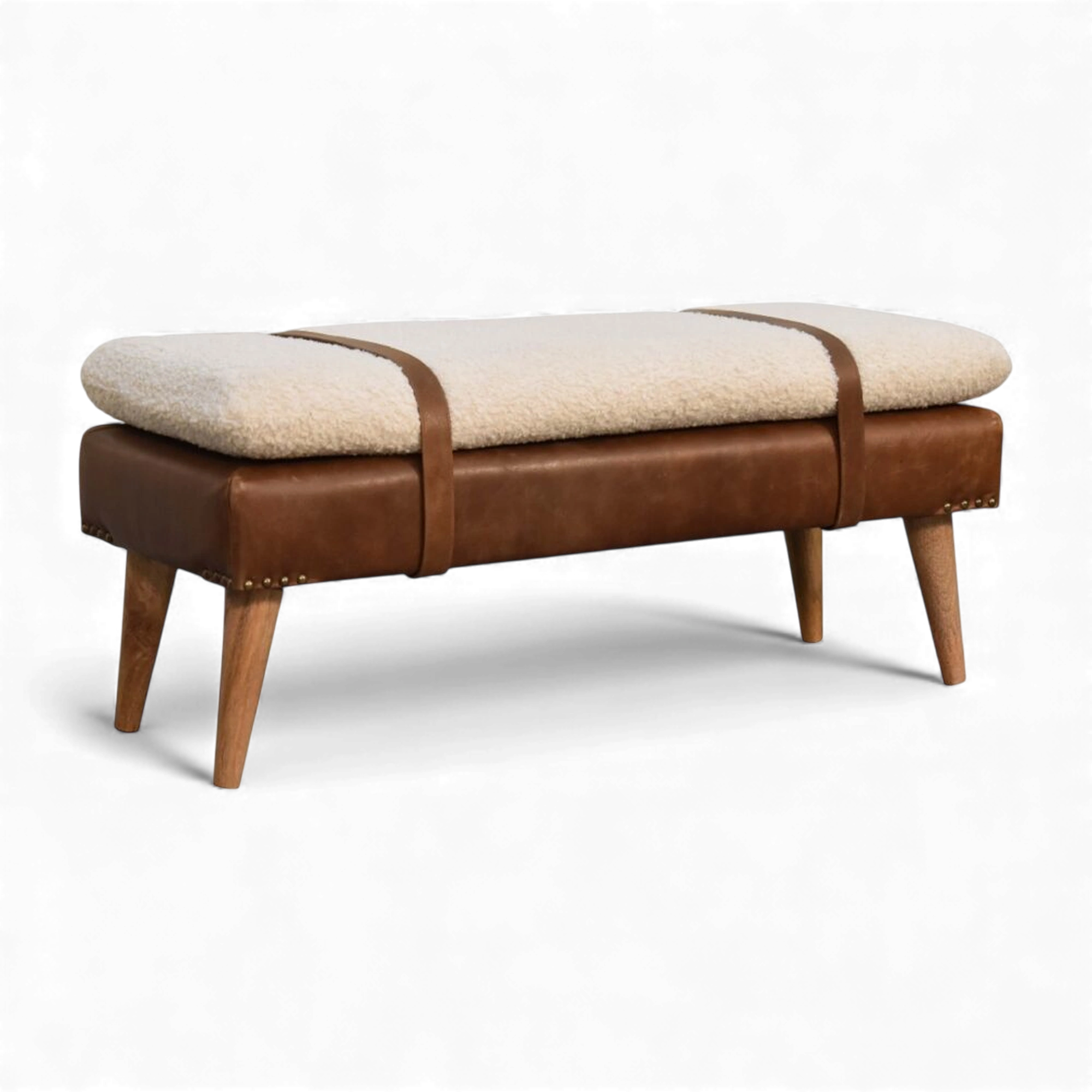 Handwoven in soft cream bouclé with natural yarn, this bench features tan buffalo leather belted straps and solid wood legs in an oak-style finish for a tactile, mixed-material look. Perfect in hallways, at the end of the bed or along a living room wall for refined extra seating.