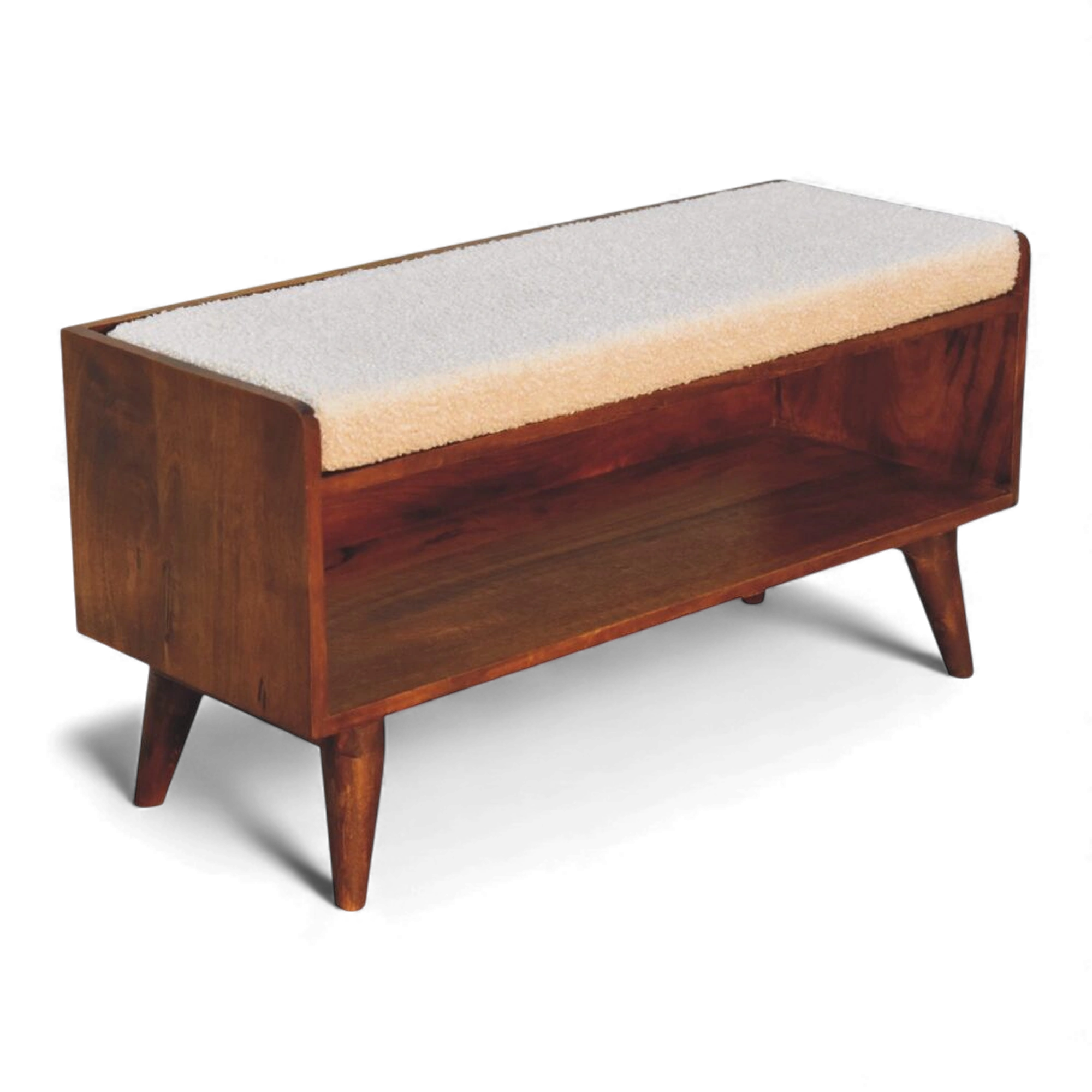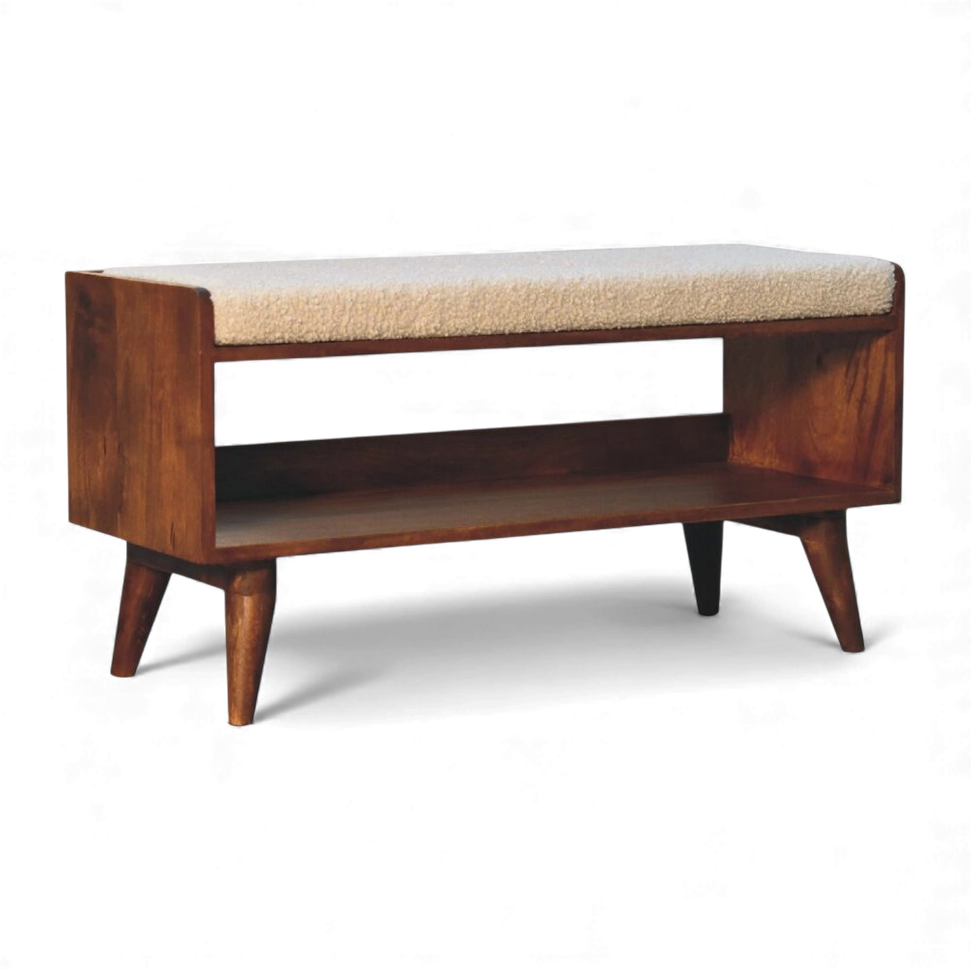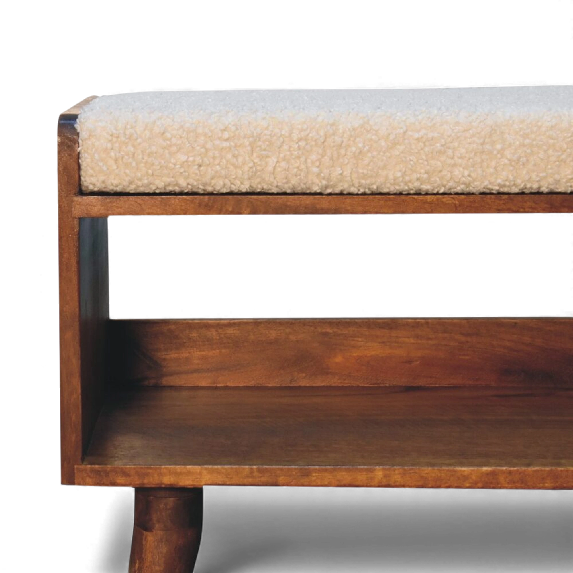 This cream bouclé storage bench sits on a Nordic-style solid mango wood base in a rich chestnut finish, with a cushioned seat pad above concealed internal storage for shoes or everyday essentials. Its compact, clean-lined silhouette works beautifully in hallways, bedrooms or living rooms.