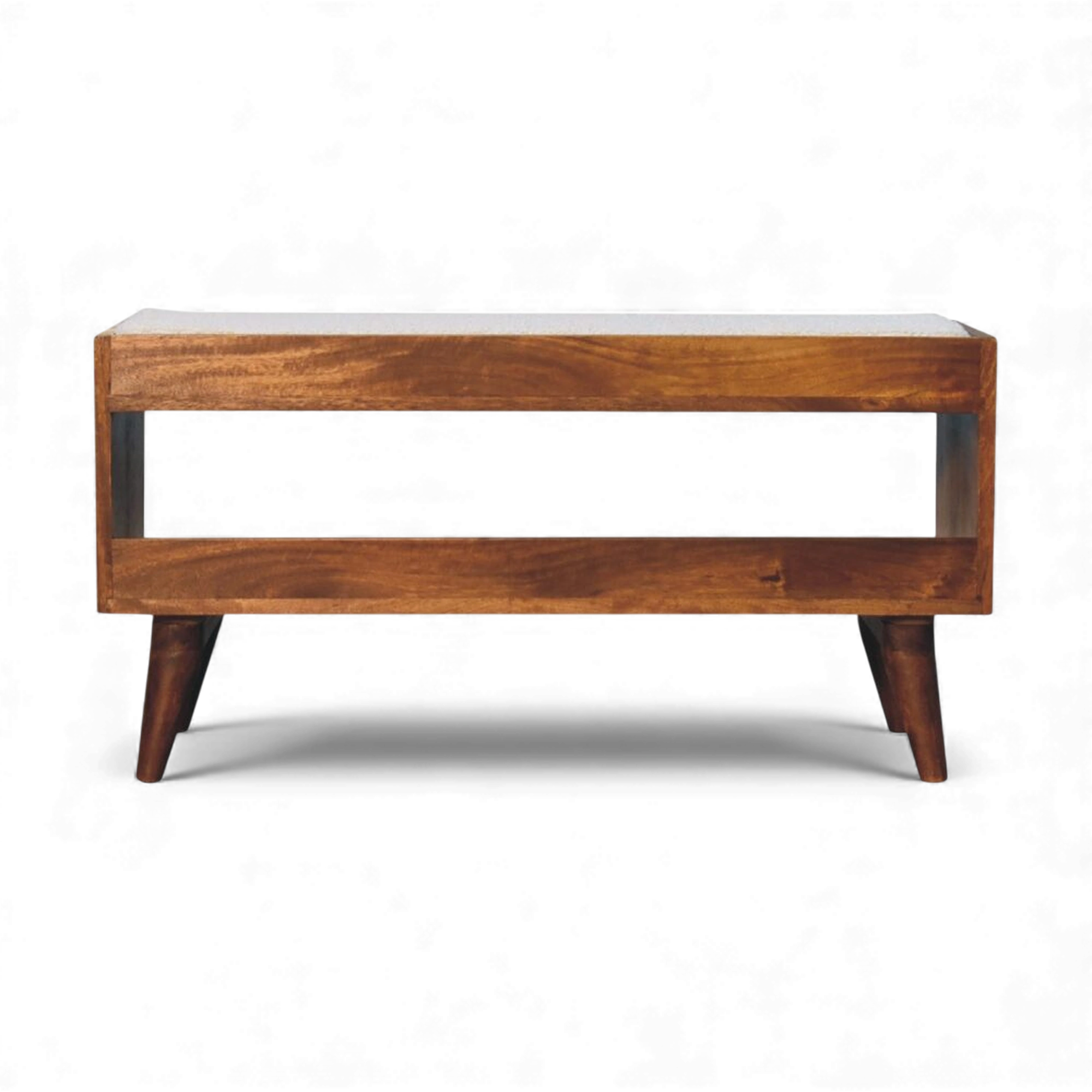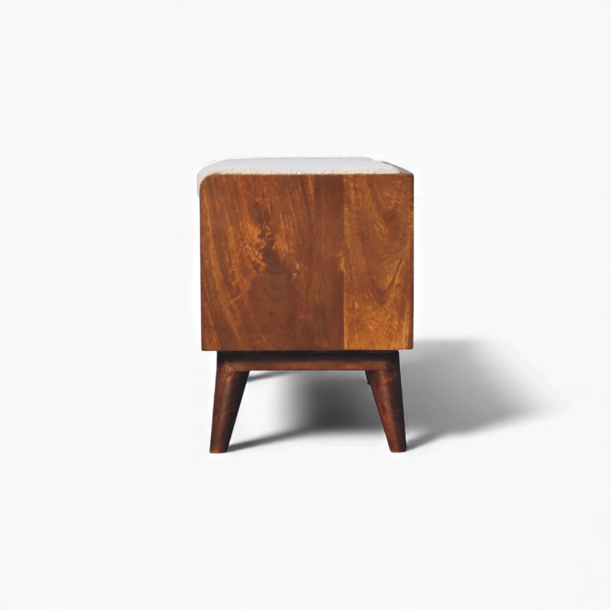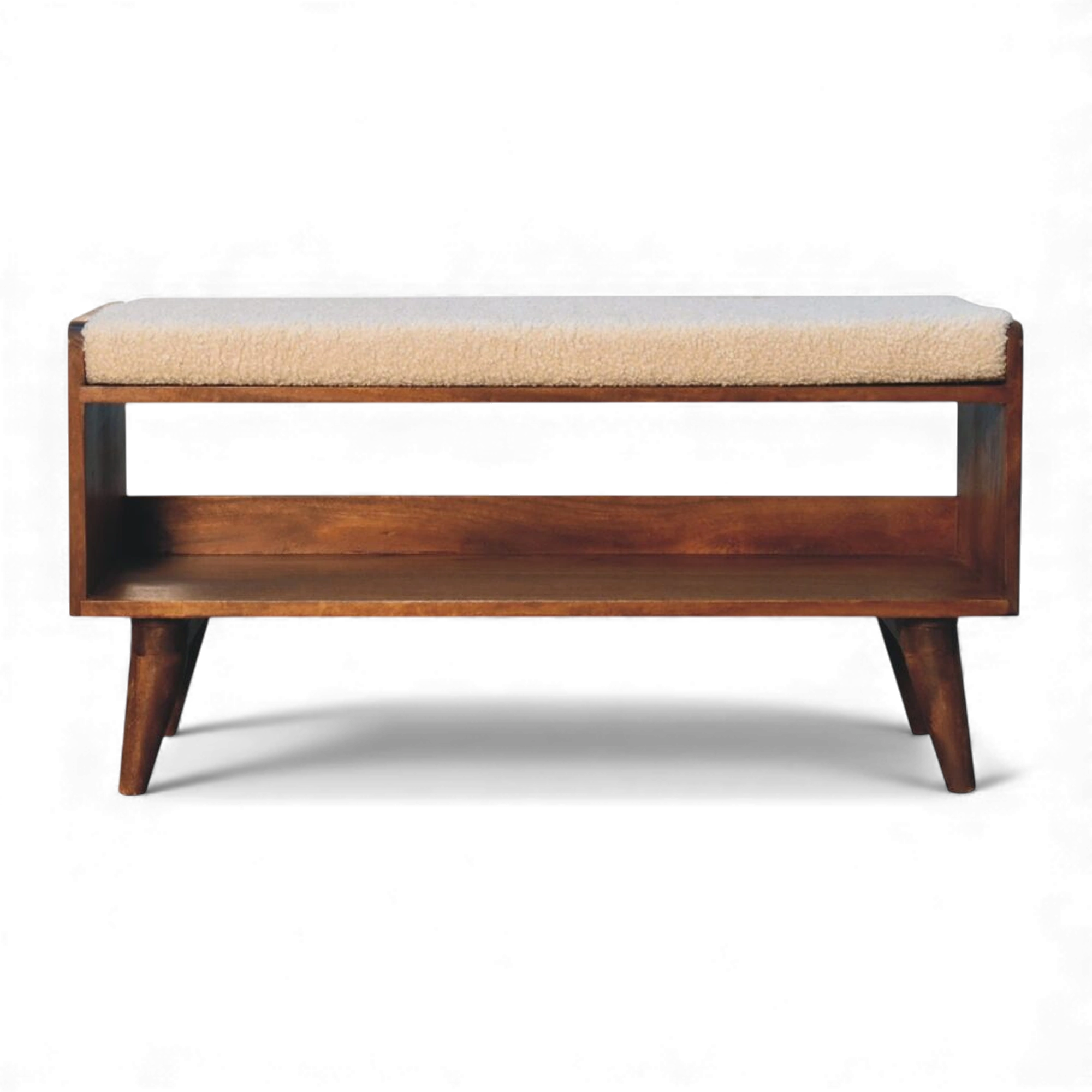 This cream bouclé storage bench sits on a Nordic-style solid mango wood base in a rich chestnut finish, with a cushioned seat pad above concealed internal storage for shoes or everyday essentials. Its compact, clean-lined silhouette works beautifully in hallways, bedrooms or living rooms.