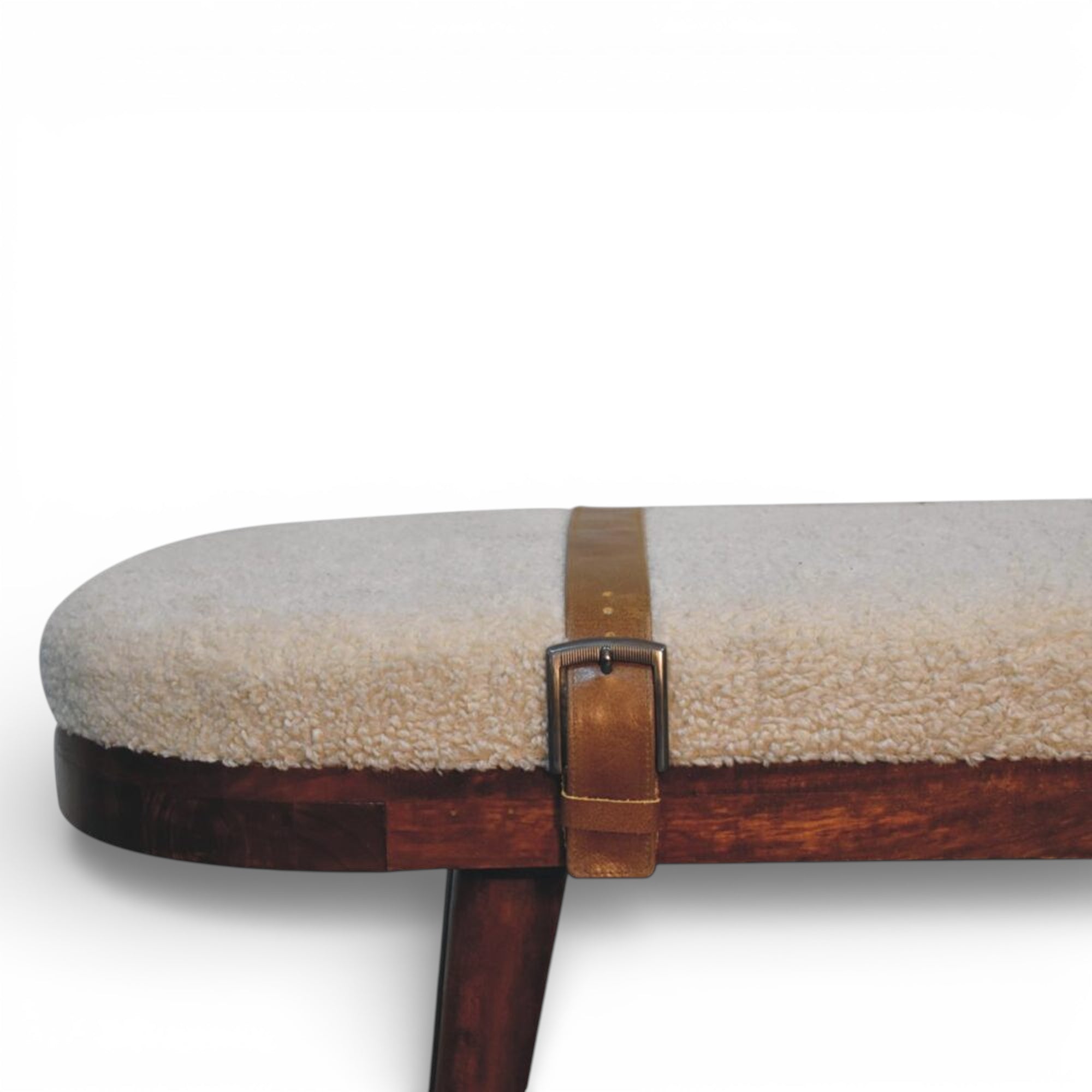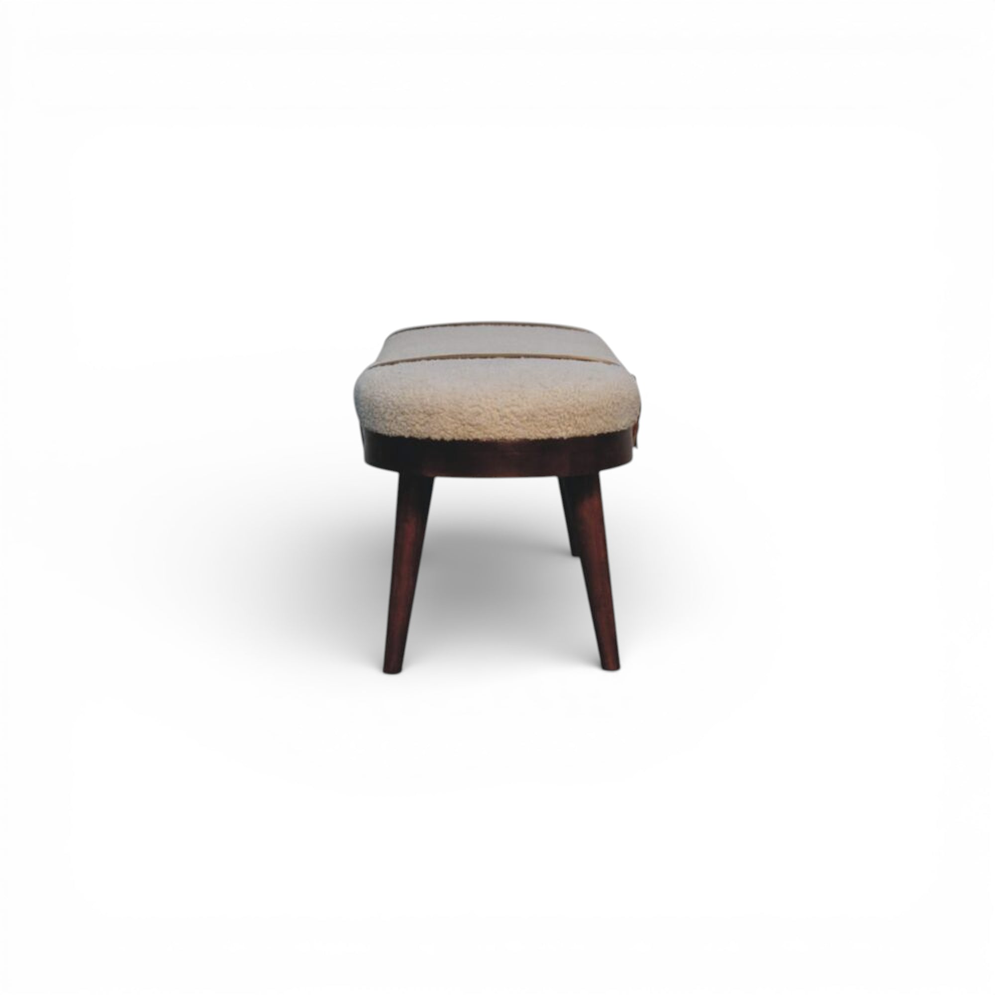 Inspired by clean Nordic design, this cream bouclé bench rests on a sleek walnut-finished solid mango wood frame with slim, tapered legs, bringing soft texture and warm structure to hallways, bedrooms or living rooms. Use it at the end of the bed or along a wall for refined extra seating.