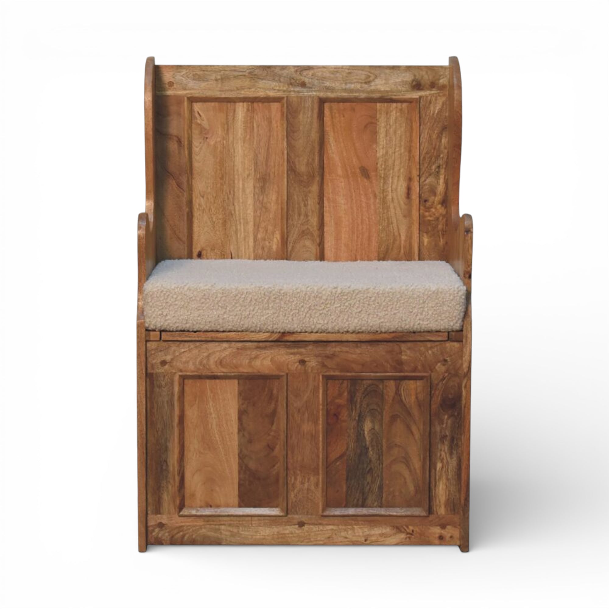 Handcrafted from solid mango wood in an oak-style finish, this cream bouclé monks bench features carved sides, panelled detailing and a lift-up seat that reveals generous hidden storage. Its compact, high-back silhouette is ideal for smaller hallways, entryways or under a window.