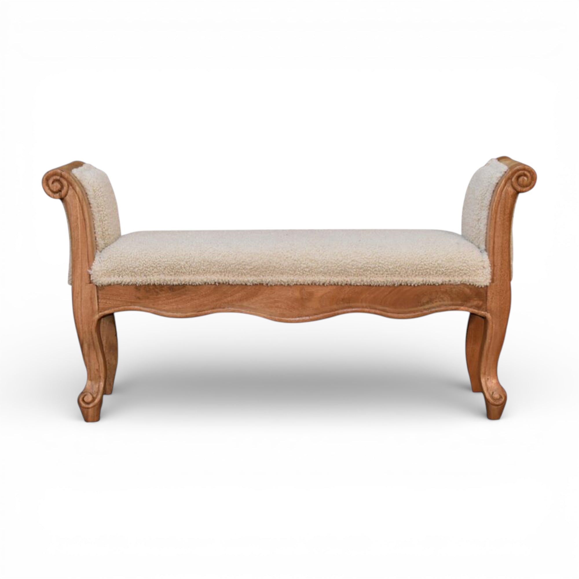 Upholstered in cream bouclé, this French-style bench features sheltering arms and hand-carved cabriole legs in an oak-style finish, bringing a romantic, sculpted profile to bedrooms, hallways or dressing areas. The cushioned seat offers elegant extra seating without overwhelming the space.