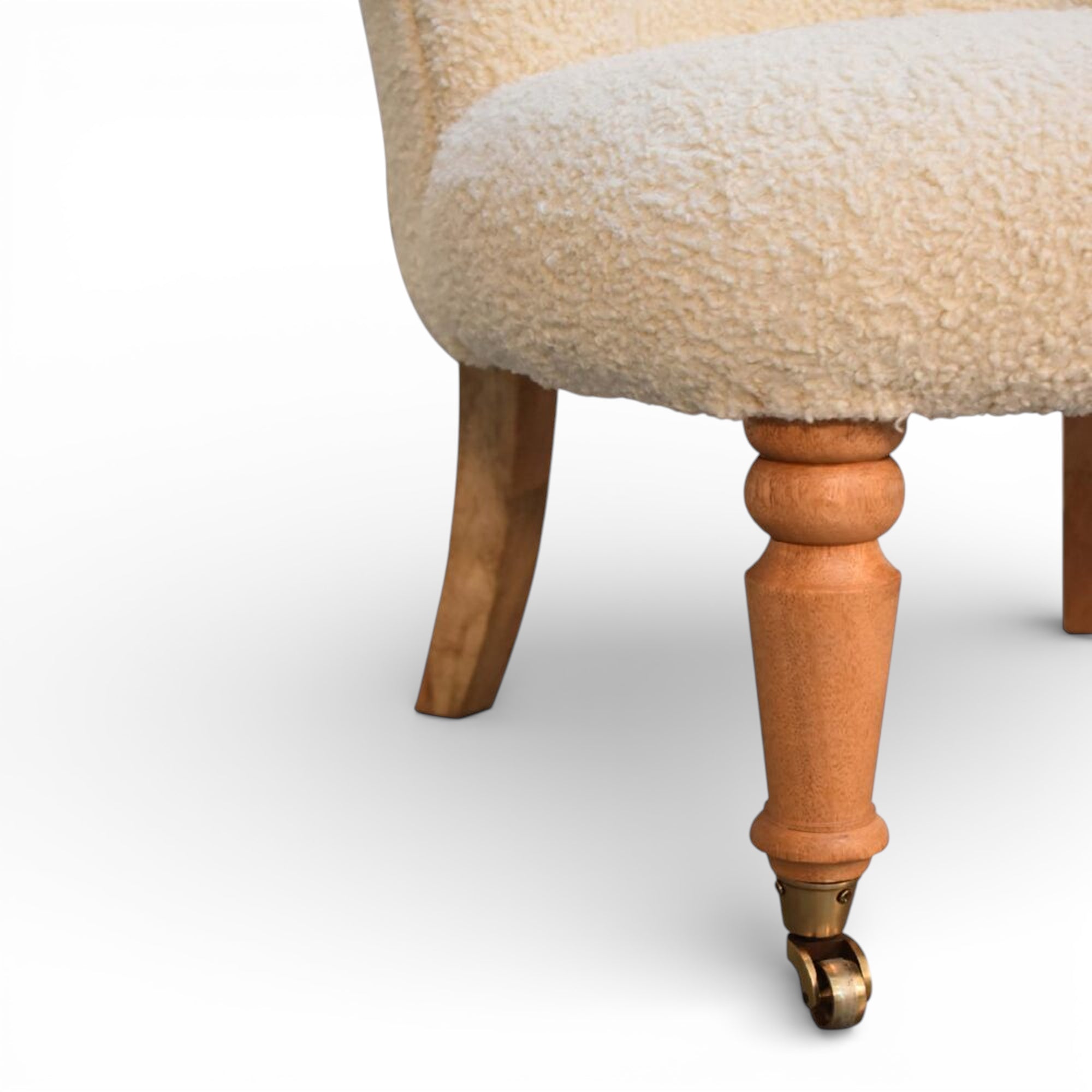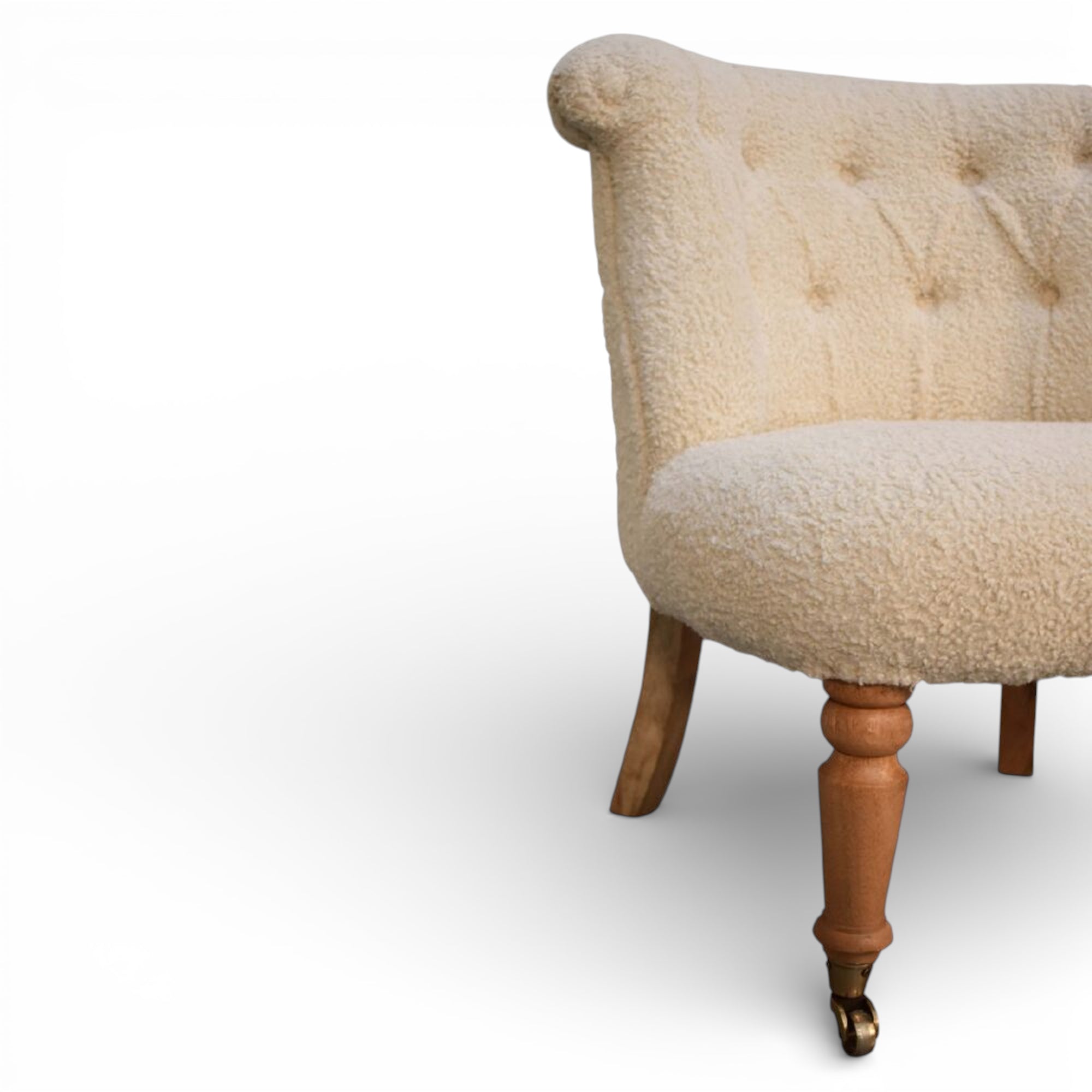 This cream bouclé accent chair features a hand-carved solid mango wood frame with deep button tufting; a high back and elegant front caster legs paired with tapered rear legs for easy placement and movement in refined living rooms or bedrooms.