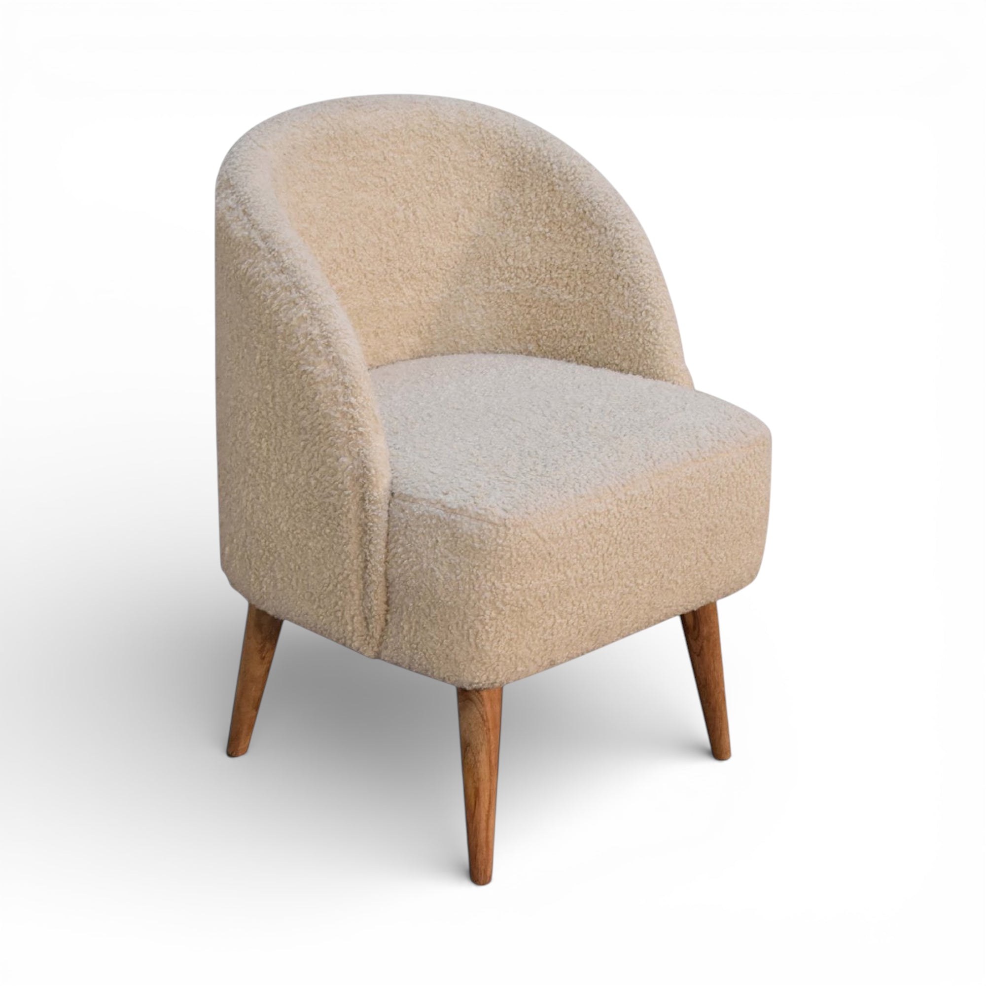 Upholstered in soft cream bouclé, this tub chair offers a gently curved back and wraparound silhouette set on tapered solid wood legs with an oak-style finish. Its compact, rounded form is perfect for refined living rooms, bedrooms or reading corners.