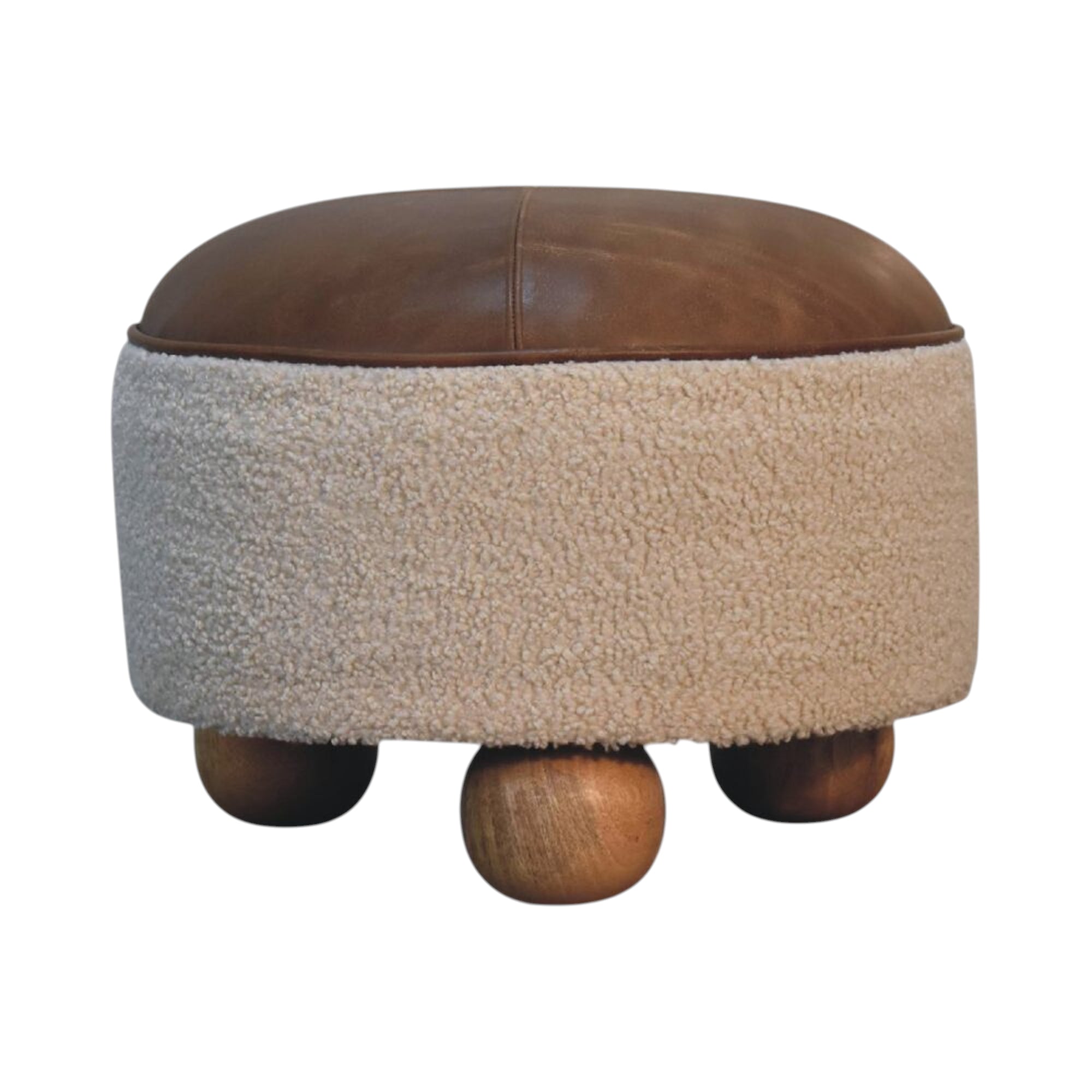 Handwoven cream bouclé wraps this round footstool, topped with a smooth buffalo hide leather seat and set on solid mango wood ball feet in an oak-style finish. A tactile mix of texture and tone, it works beautifully as a refined footrest or sculptural accent in living rooms and bedrooms.
