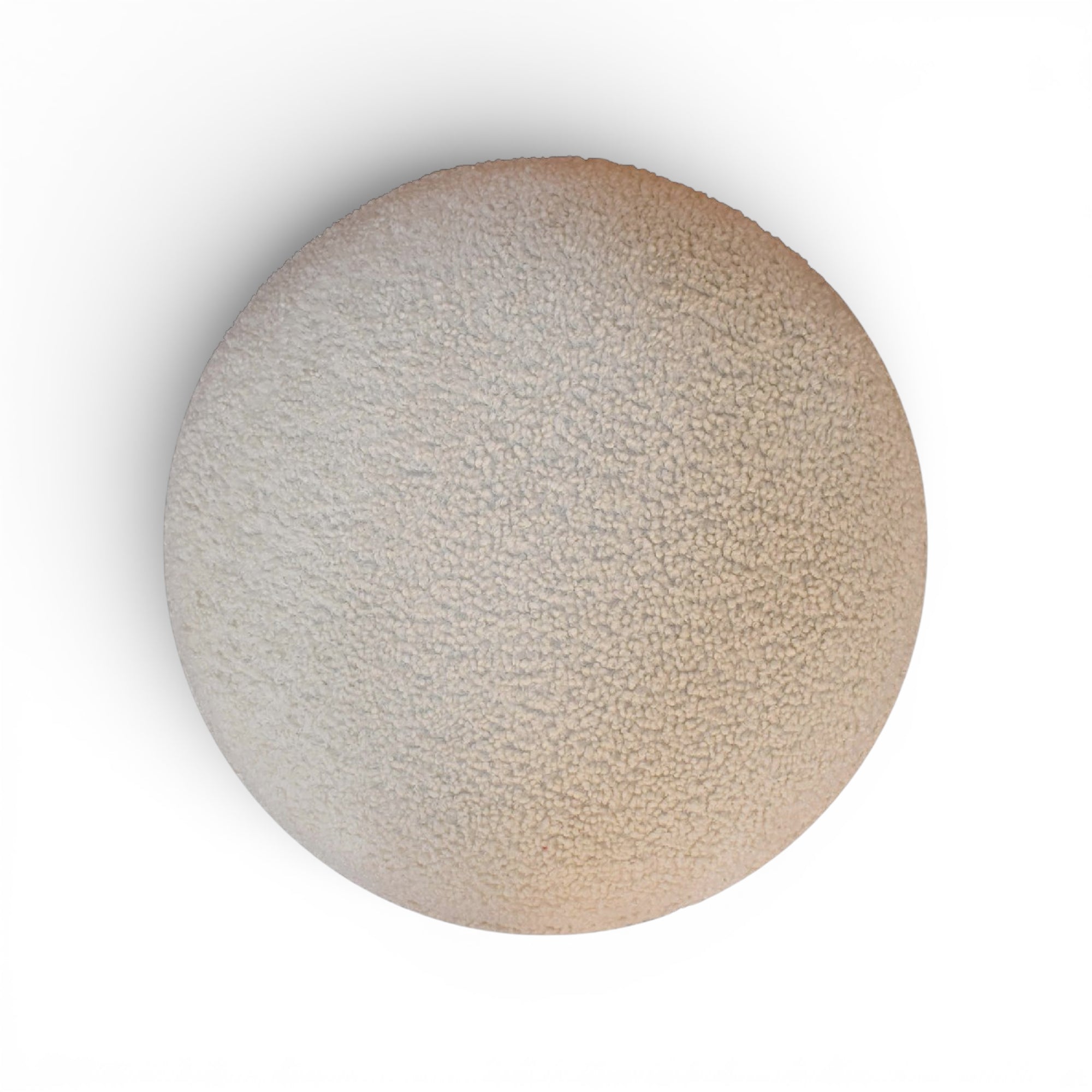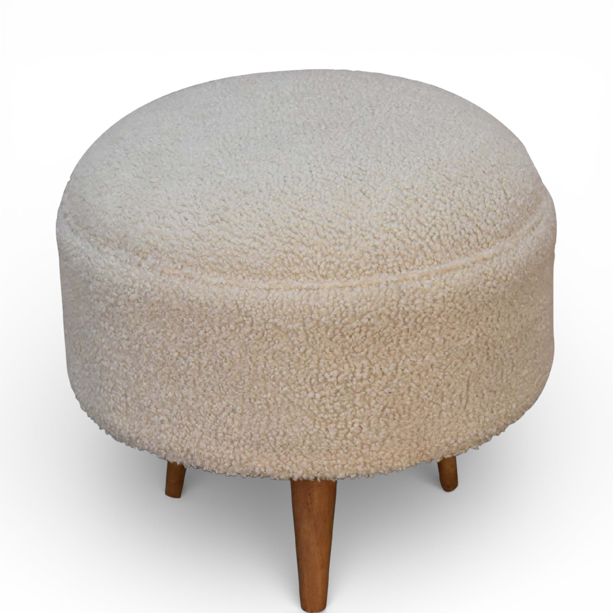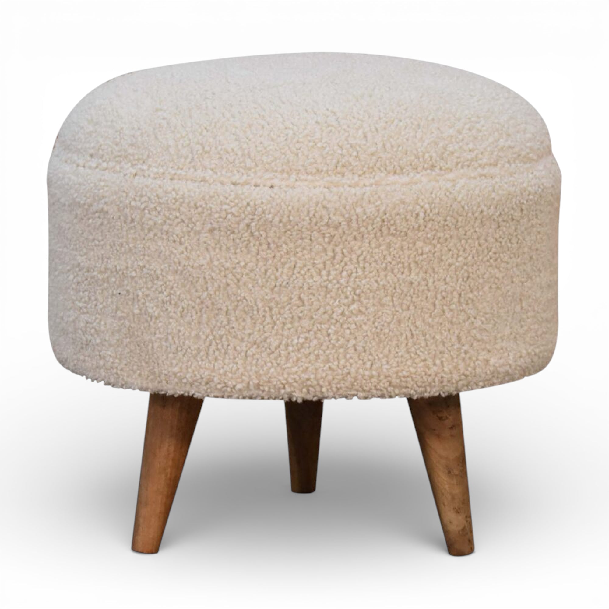 This cream bouclé footstool features a softly rounded drum silhouette with plush upholstery over a sturdy wood frame, bringing gentle texture and form to modern interiors. Perfect beside a sofa, lounge chair or at the end of the bed as a subtle accent perch.
