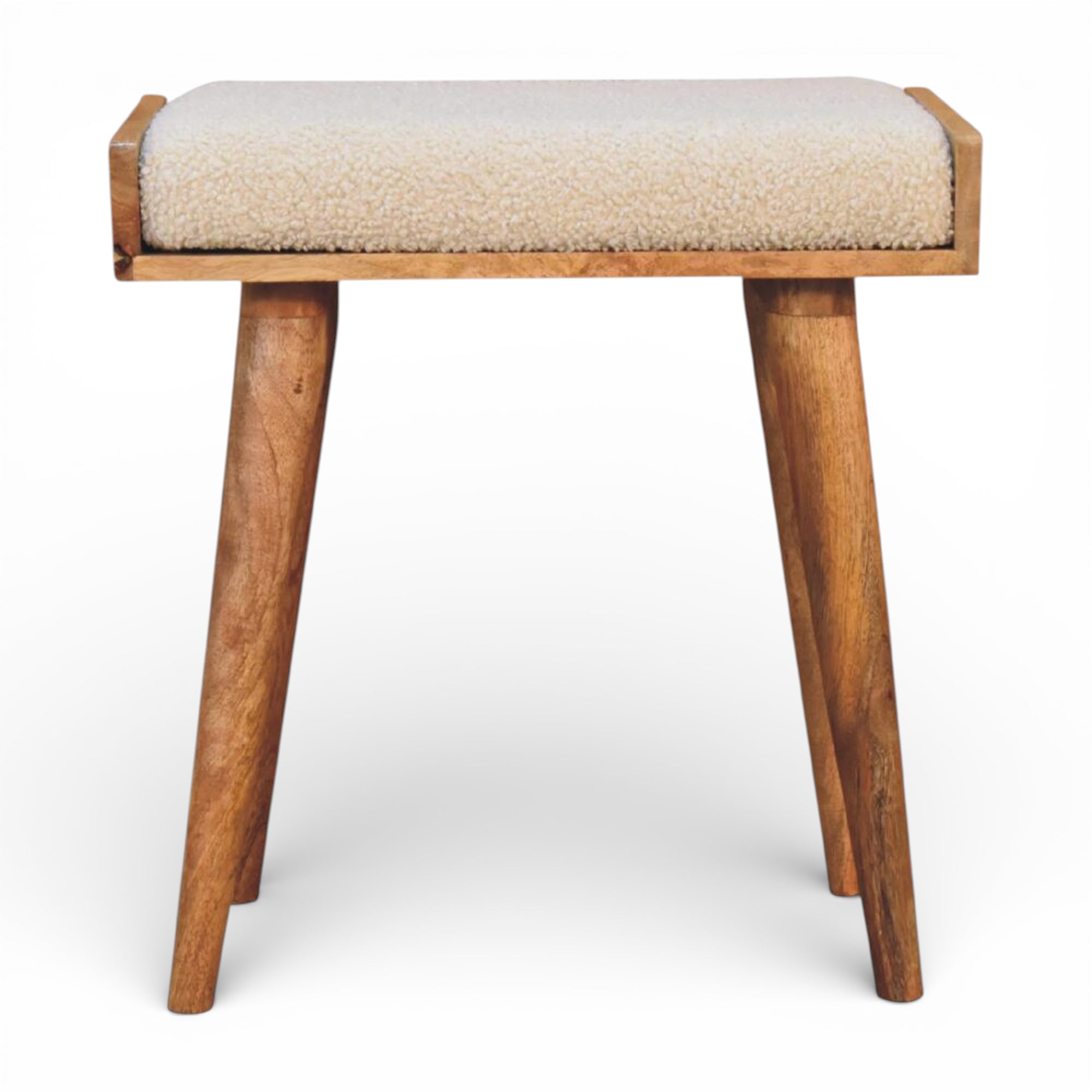 This cream bouclé footstool features a slim tray-style seat on four Nordic solid mango wood legs in an oak-style finish, bringing soft texture and light structure to modern spaces. Perfect as a compact perch or refined footrest beside a sofa, armchair or bed.
