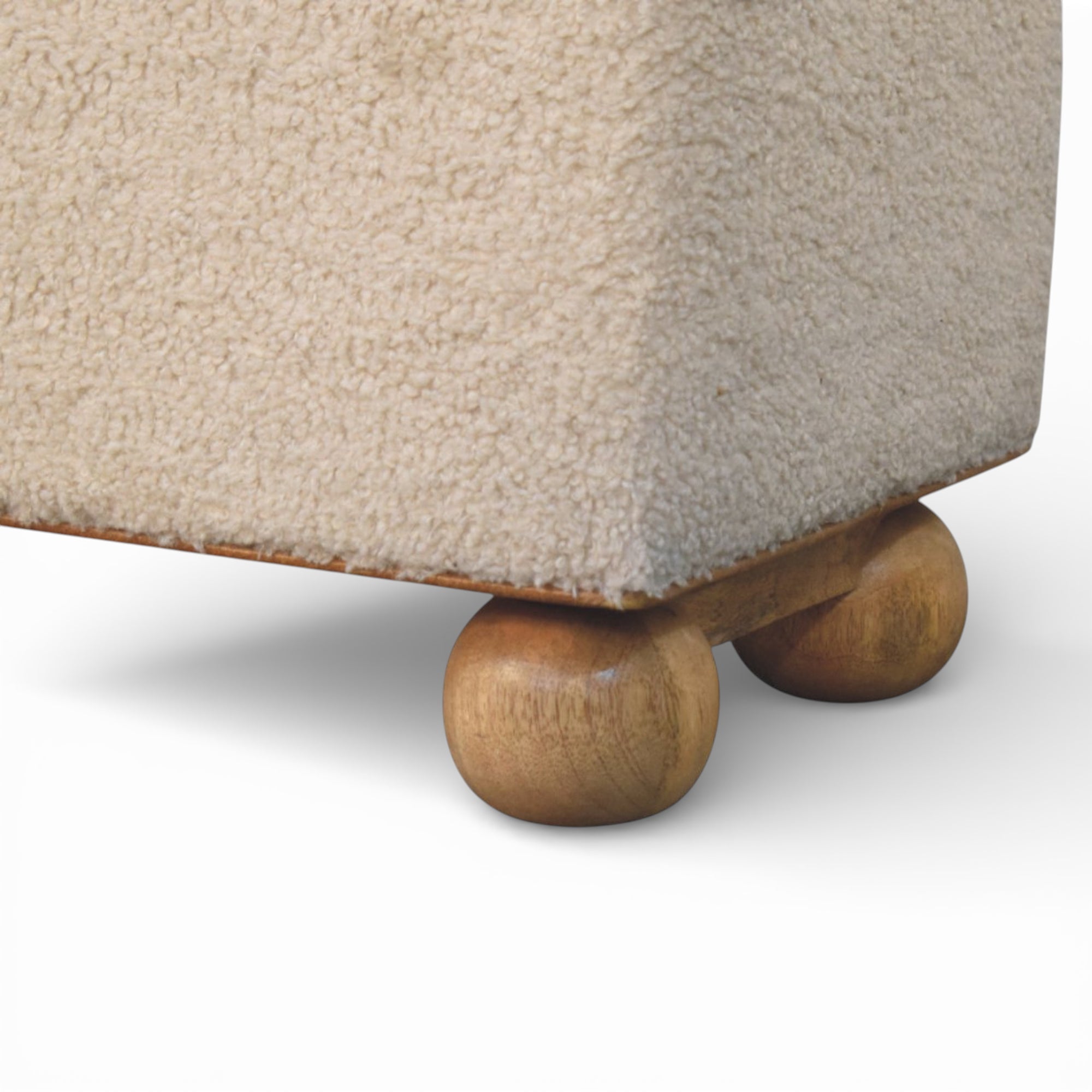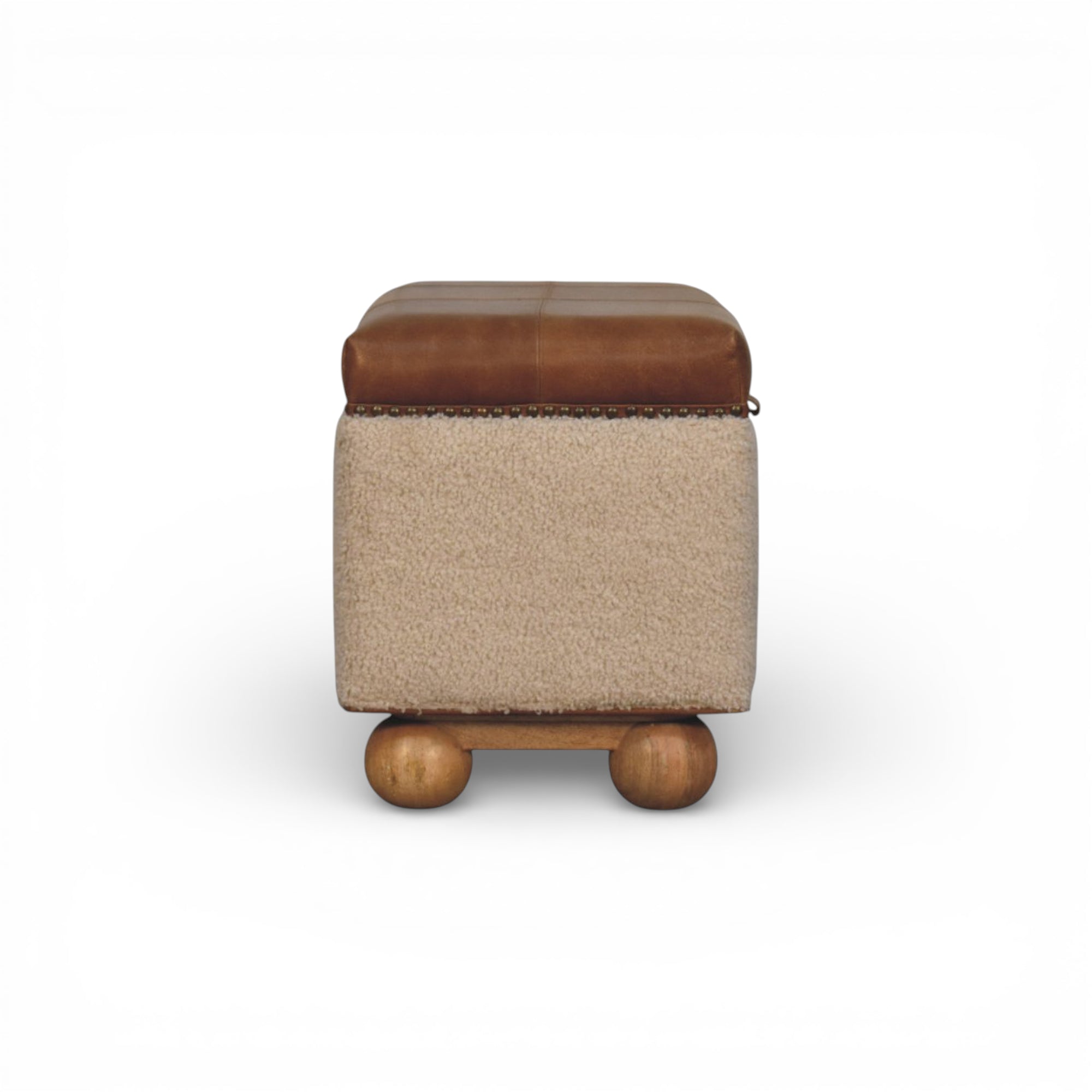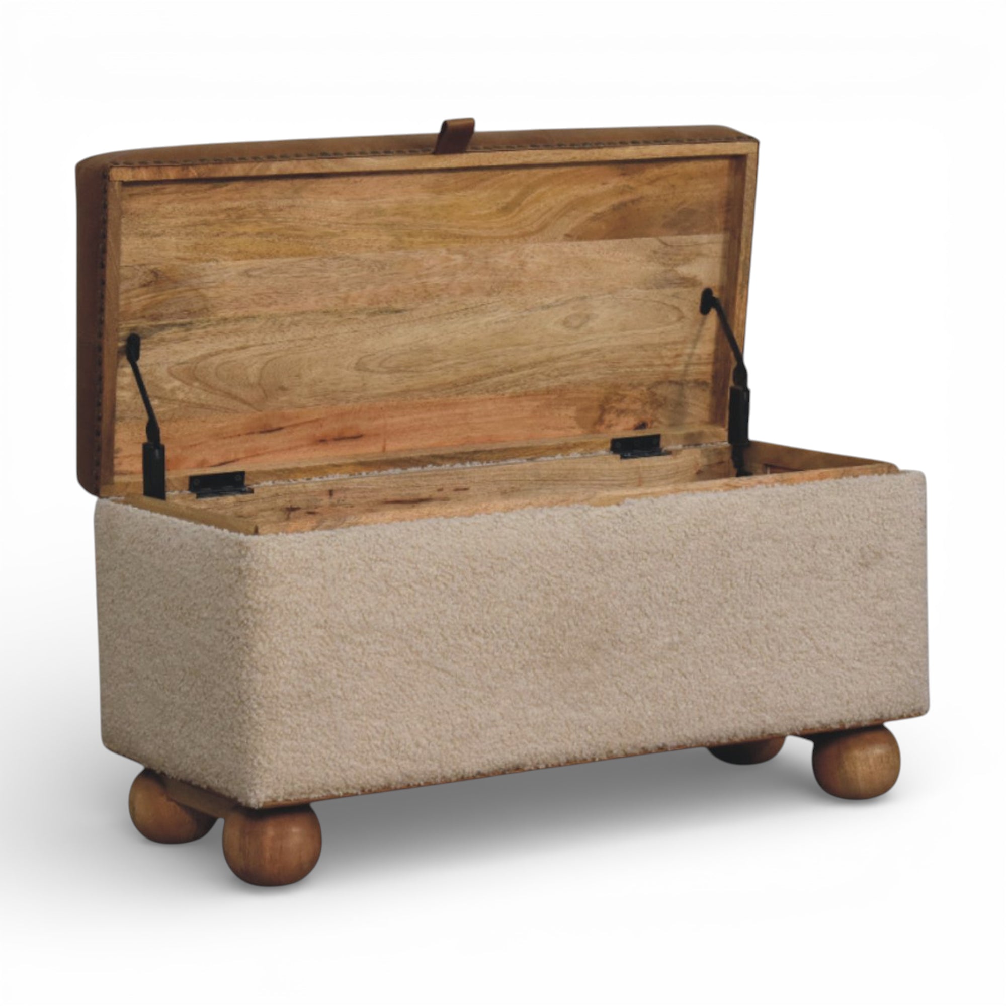 This lid-up storage ottoman pairs soft cream bouclé sides with a smooth buffalo leather top and hand-turned solid wood feet, bringing tactile contrast and trunk-style elegance to modern interiors. Lift the cushioned lid to reveal generous hidden storage for blankets or everyday essentials in the bedroom or living room.