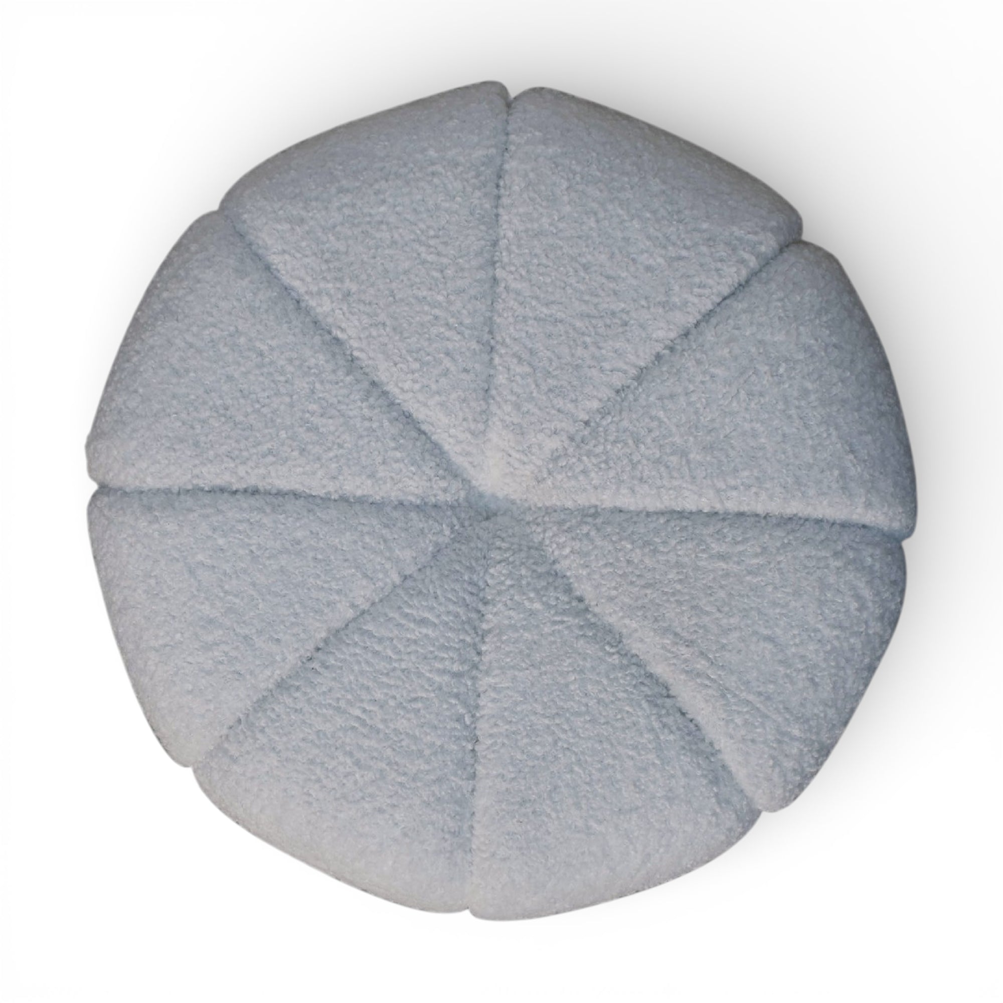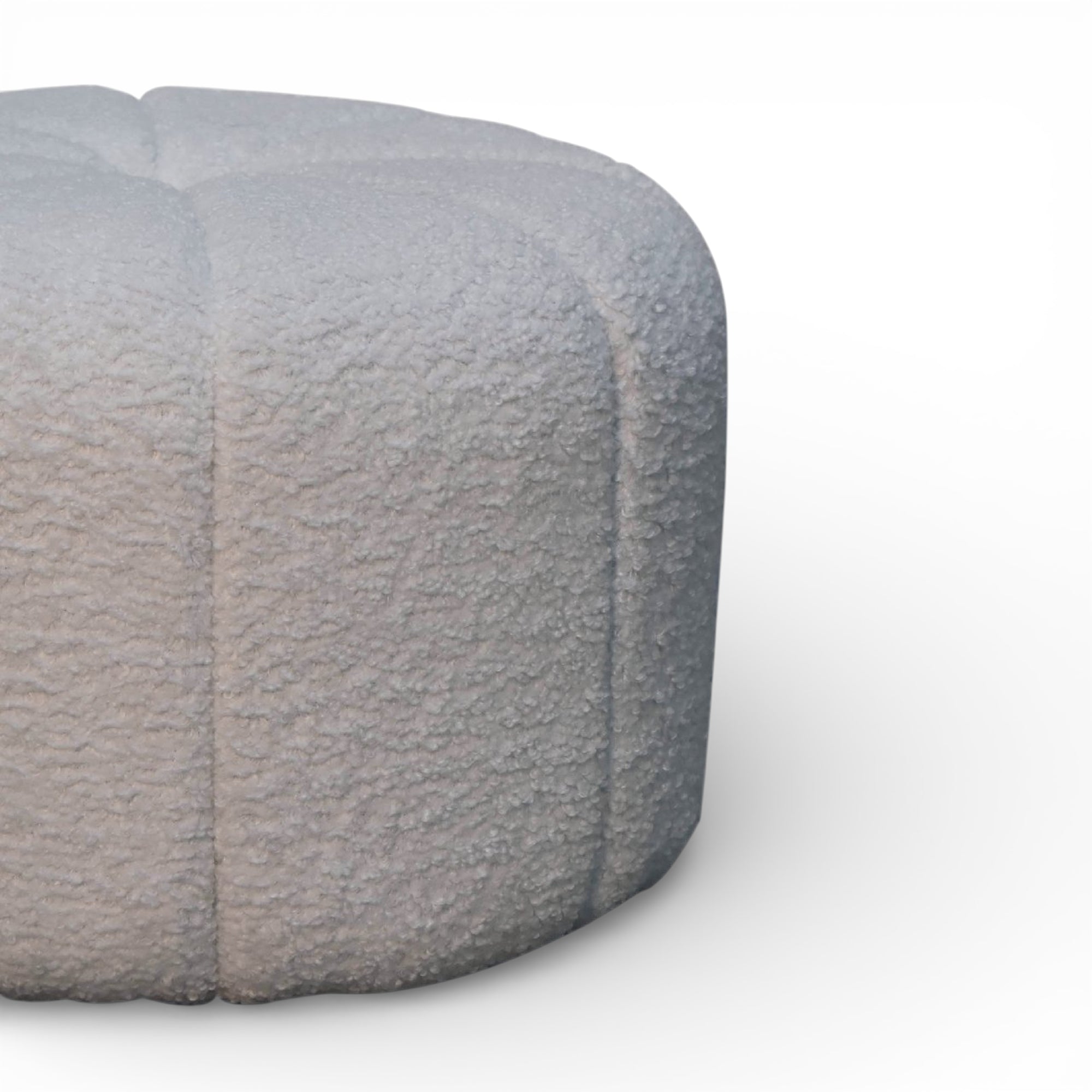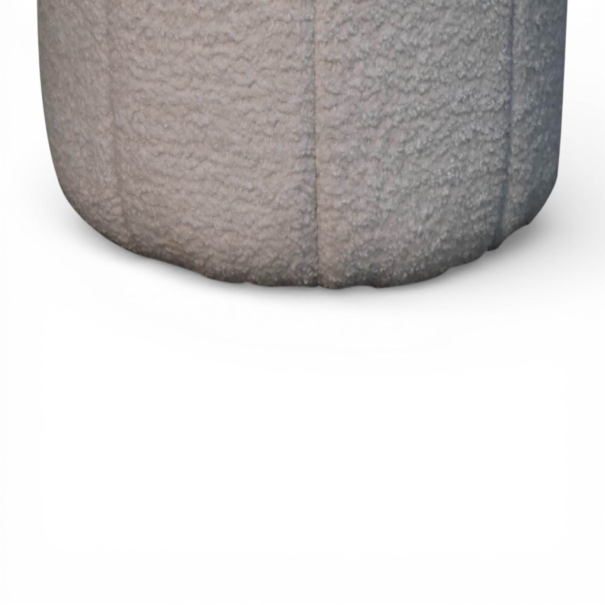 This white bouclé footstool features a rounded circus-style drum silhouette over a solid wood frame, adding soft texture and shape to bedrooms or living spaces. Use it as a refined footrest, extra perch or sculptural accent beside your sofa or lounge chair.