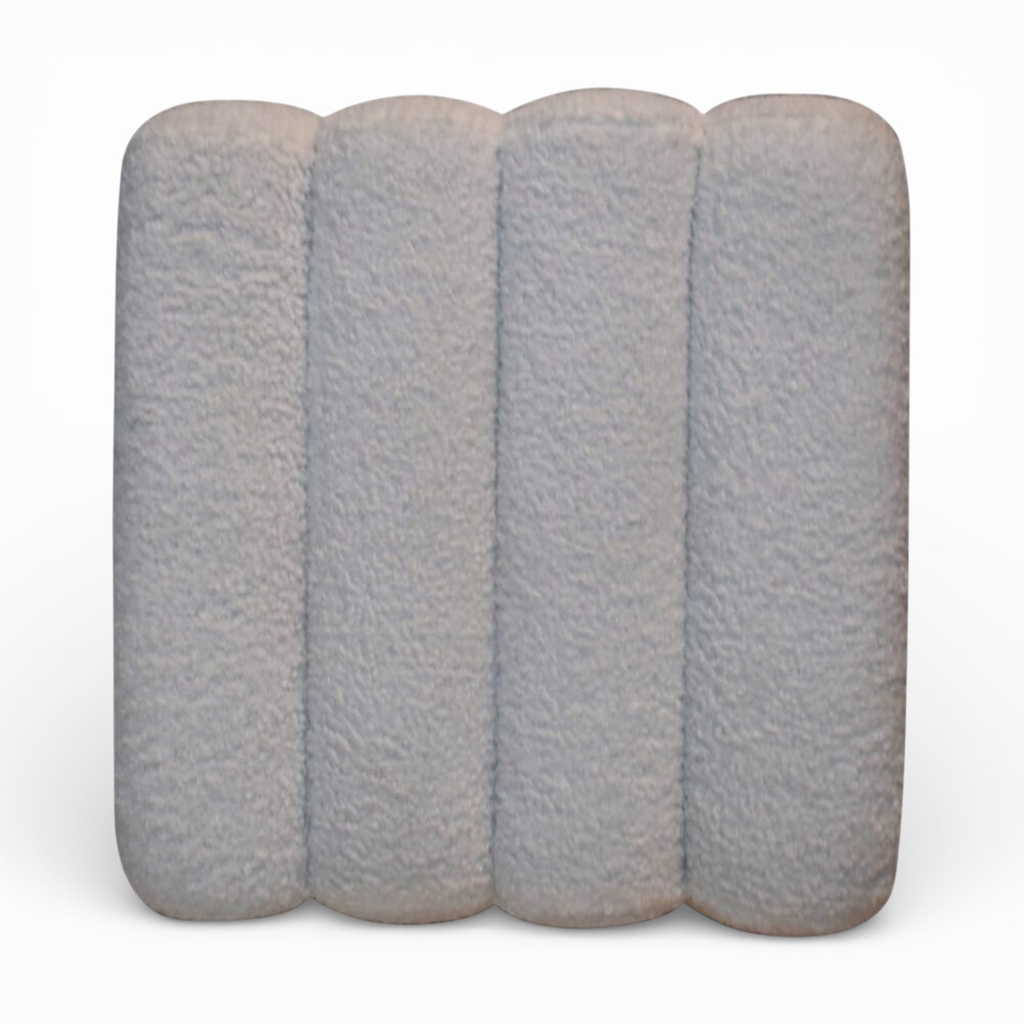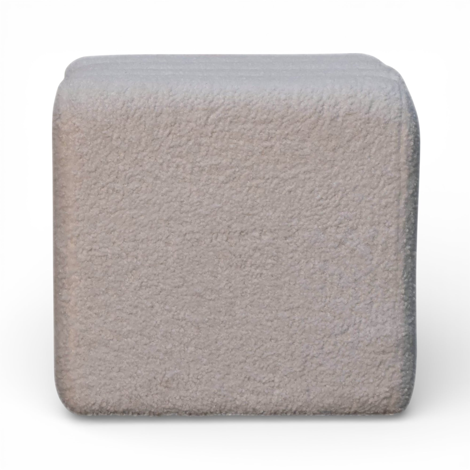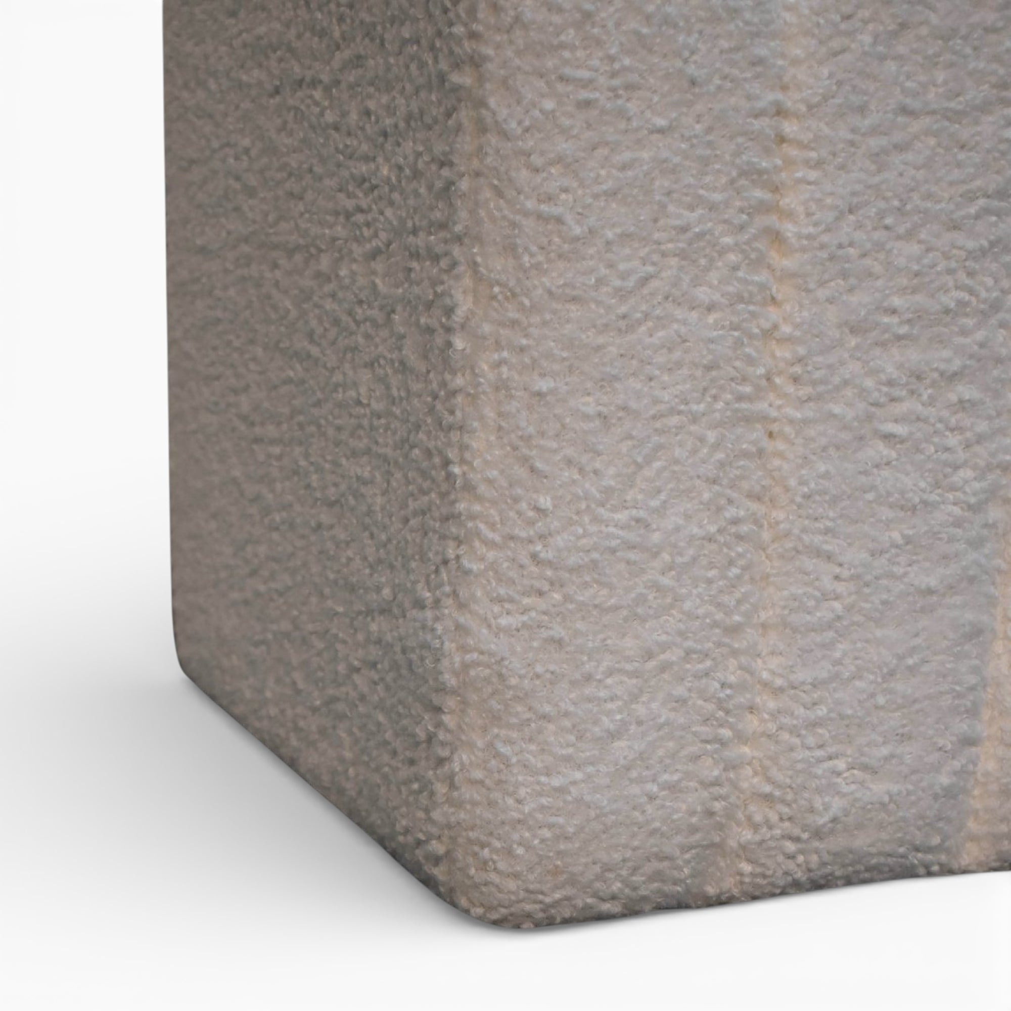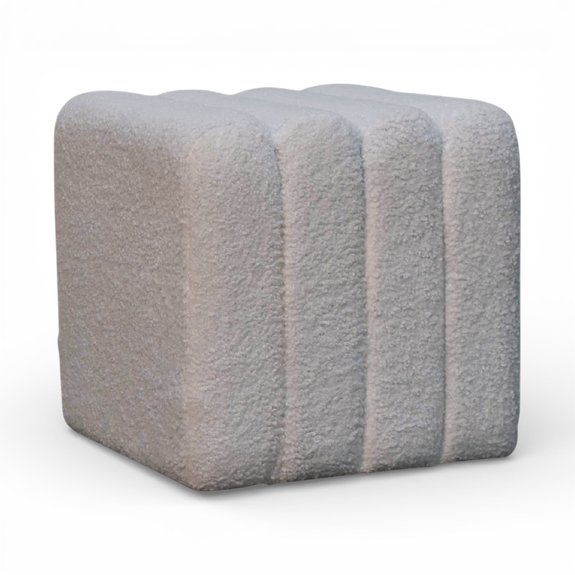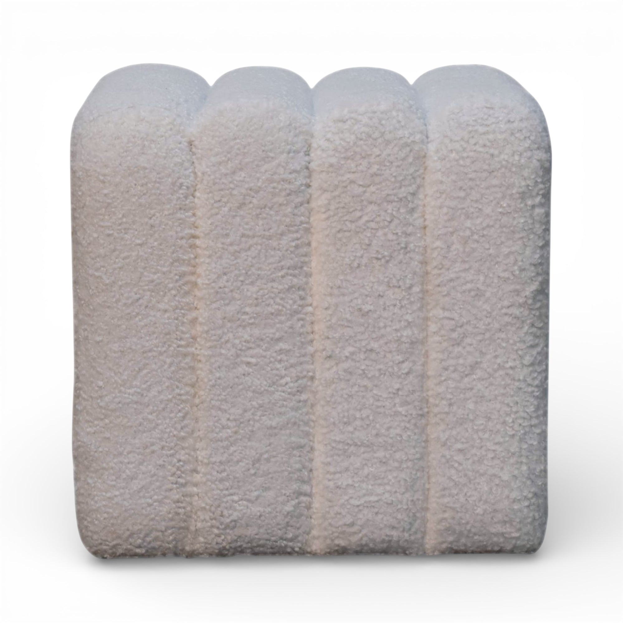 This sculpted white bouclé footstool features a softly wavy top and plush upholstery over a solid wood frame, bringing subtle texture and form to modern living spaces. Its compact cube silhouette sits perfectly in front of a sofa, lounge chair, or at the end of the bed.