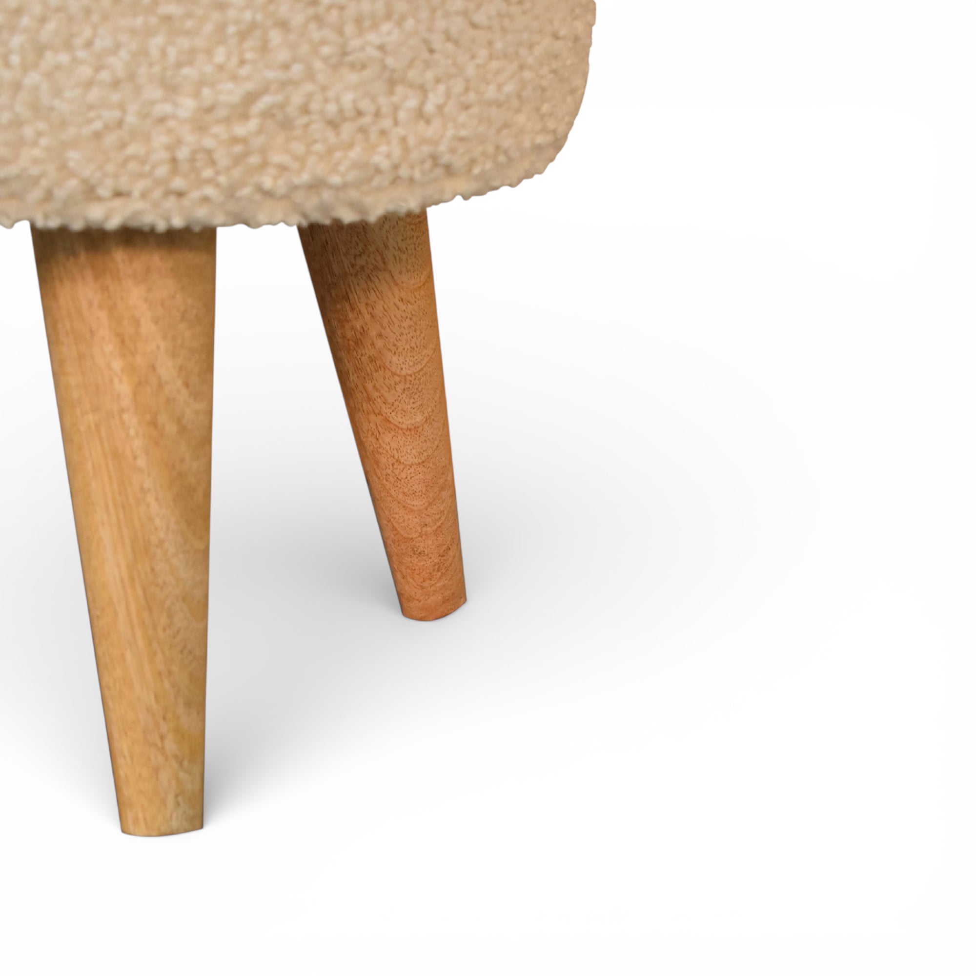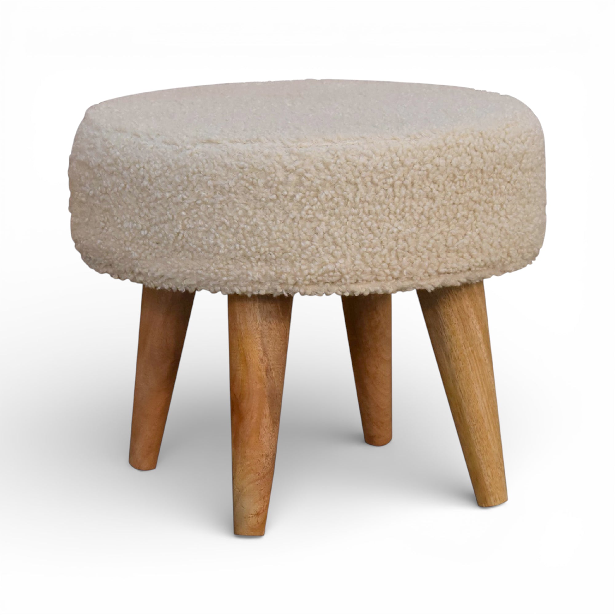 This cream bouclé footstool features a softly rounded seat on tapered solid wood legs, bringing gentle texture and lightness to compact spaces. Ideal as a small footrest, extra perch or subtle accent beside a sofa or bedroom chair.