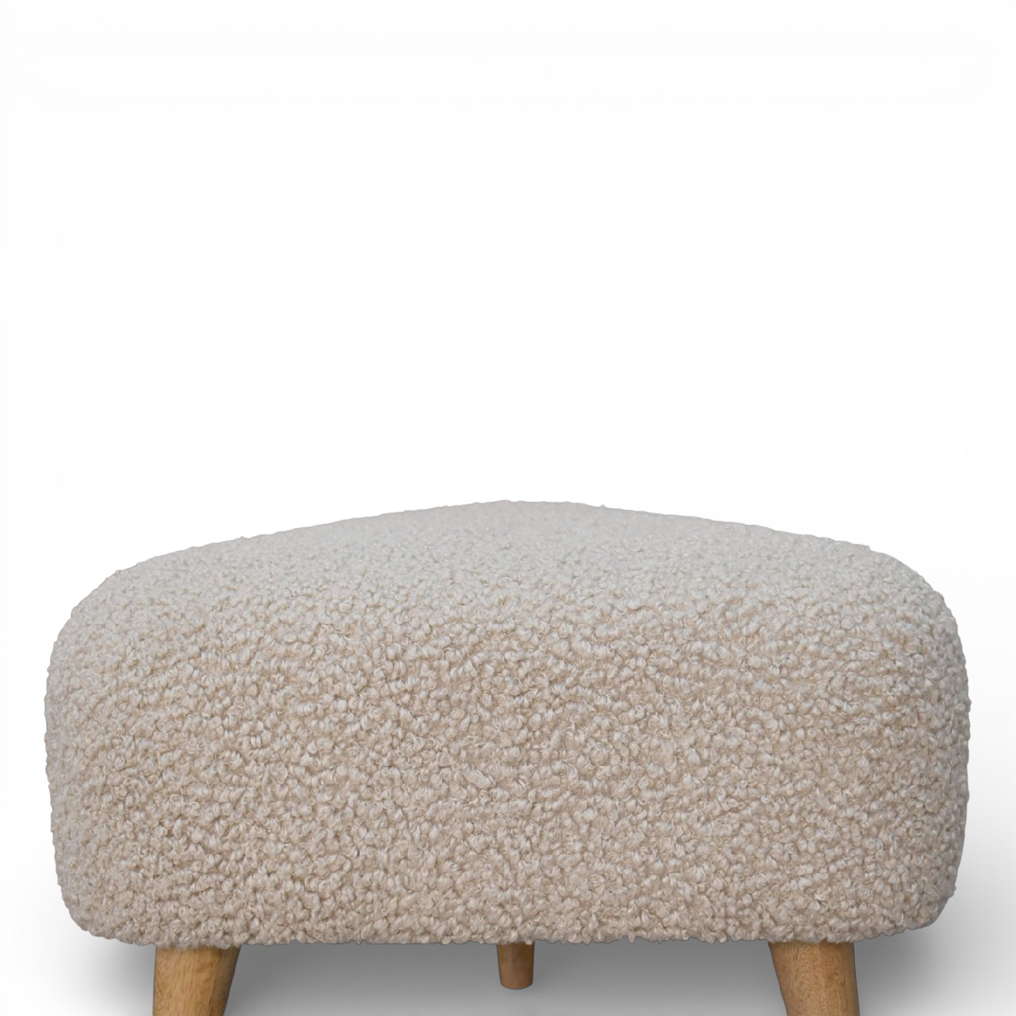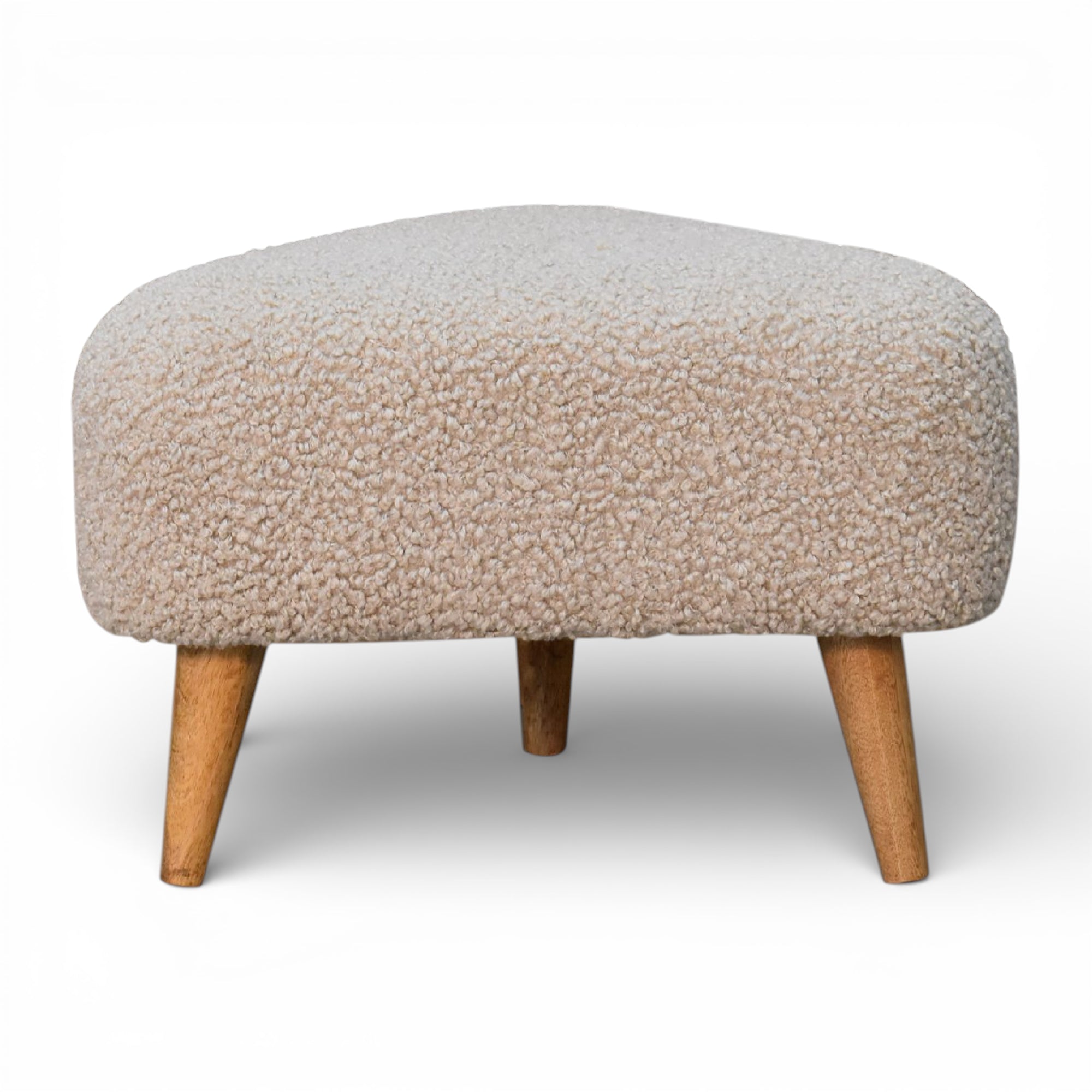 Upholstered in textured mud bouclé, this triangular footstool rests on four Nordic-style solid mango wood legs in an oak-finish, adding sculptural warmth to modern interiors. Its compact profile tucks neatly beside a sofa, lounge chair, or at the end of the bed.